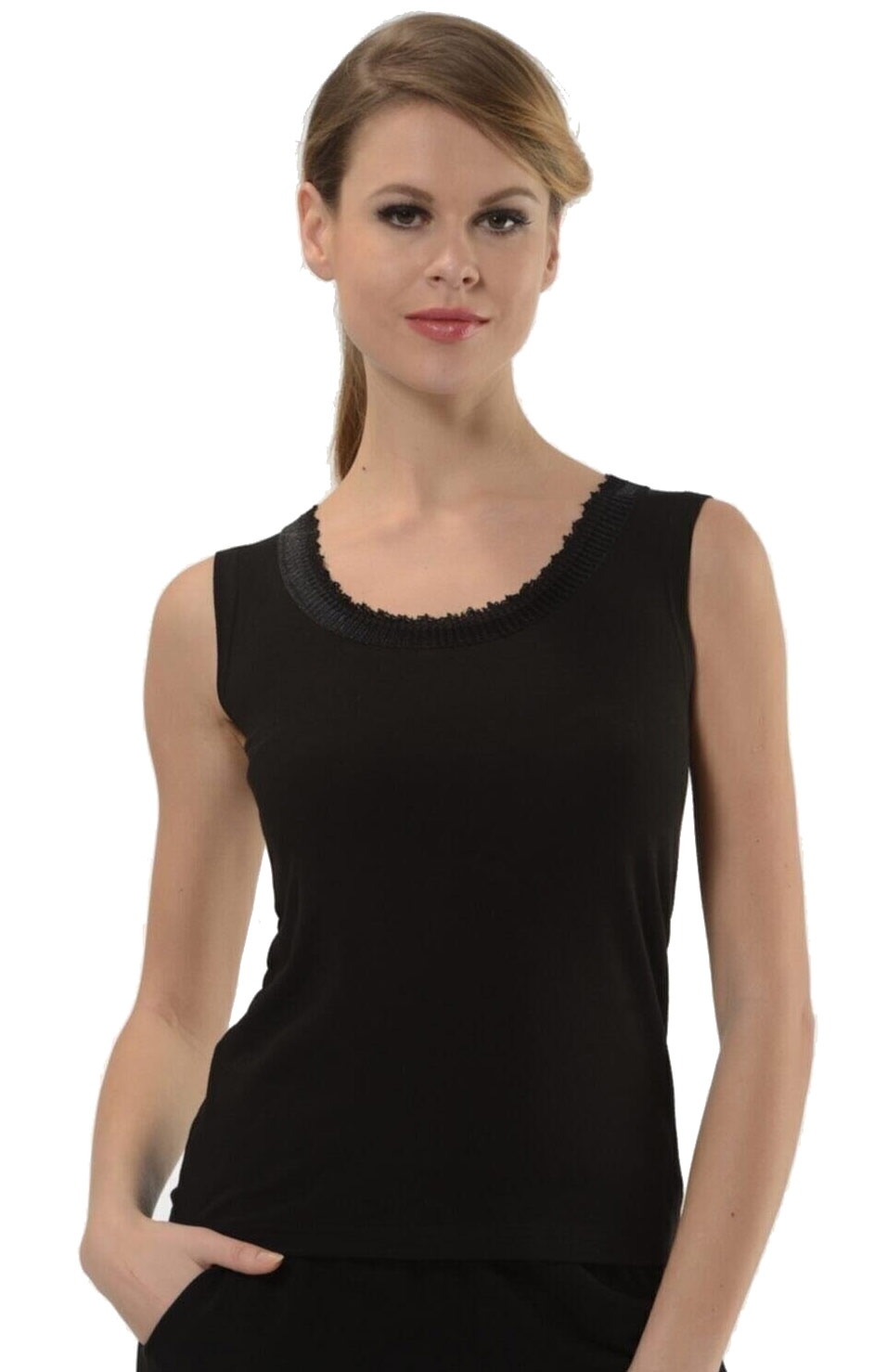 Siyah renkte, dikişsiz yapıya sahip likralı atlet, esnek ve nefes alabilen kumaş dokusuyla konfor sunuyor. %92 Koton, %8 Elastan