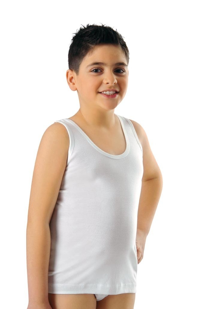Beyaz renkte, yumuşak dokulu ve rahat kesime sahip erkek çocuk atlet.