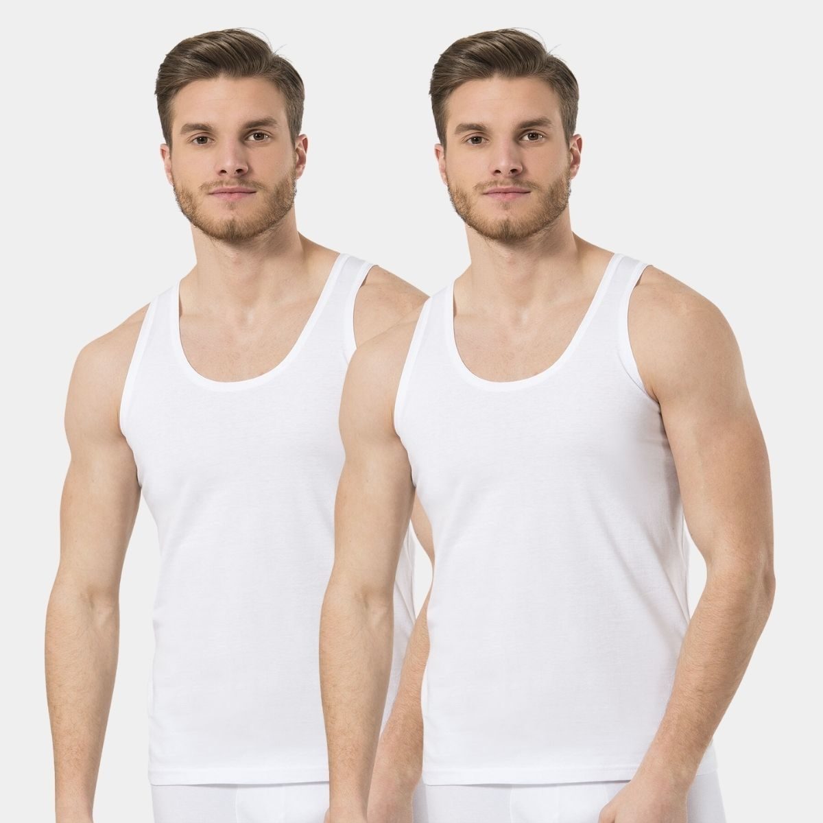 Beyaz renkte, pamuklu ribana dokusuna sahip, esnek kesim erkek atlet. %100 Pamuk
