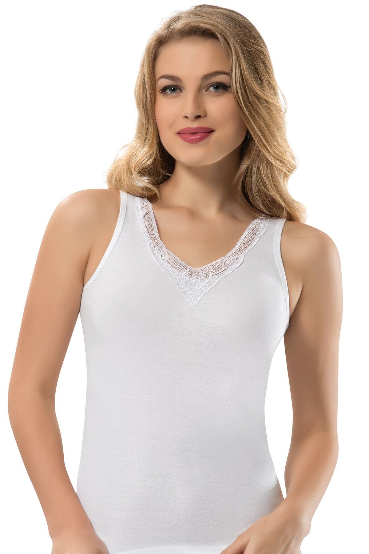 Beyaz renkte, ribana dokusu ve güpür detaylarıyla tasarlanmış kadın atlet. %100 Pamuk
