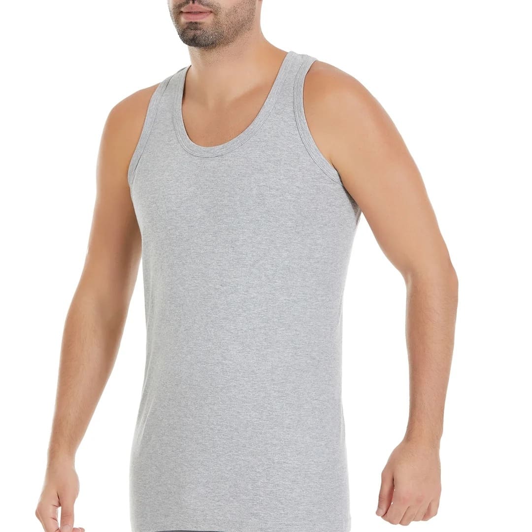 Gri tonlarında, ribana kesim pamuklu atlet. Esnek yapısıyla konfor sunar ve hareket özgürlüğü sağlar. %100 Pamuk