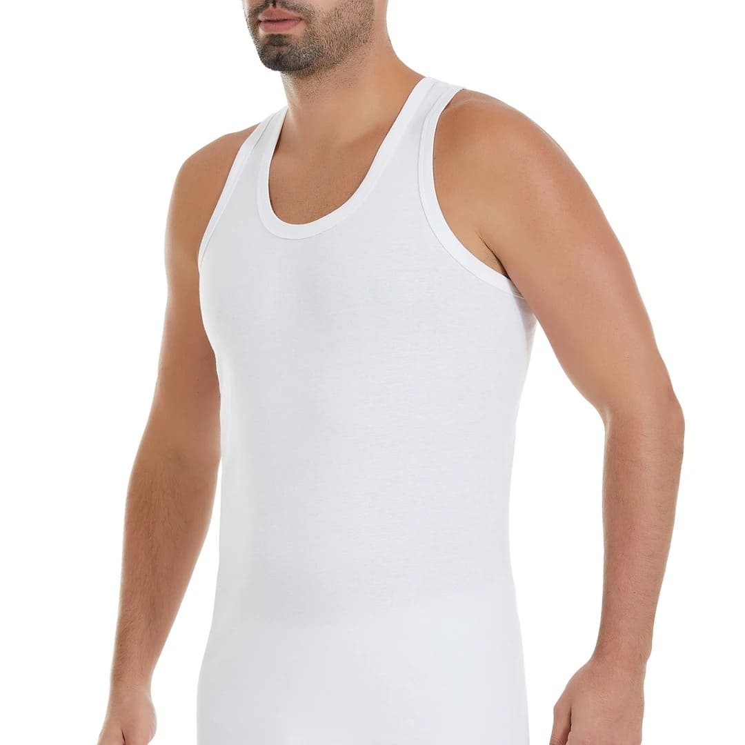 Beyaz renkte, ribana dokusuyla esnek bir kesime sahip pamuklu erkek atlet. %100 Pamuk
