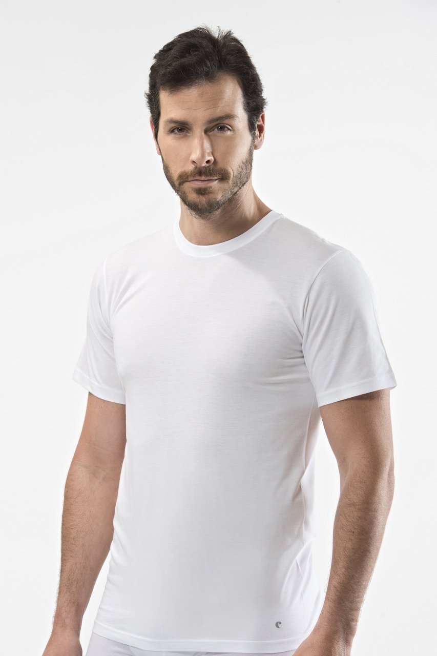 Beyaz renkte, pamuklu ribana kumaştan üretilmiş O yaka erkek atlet.