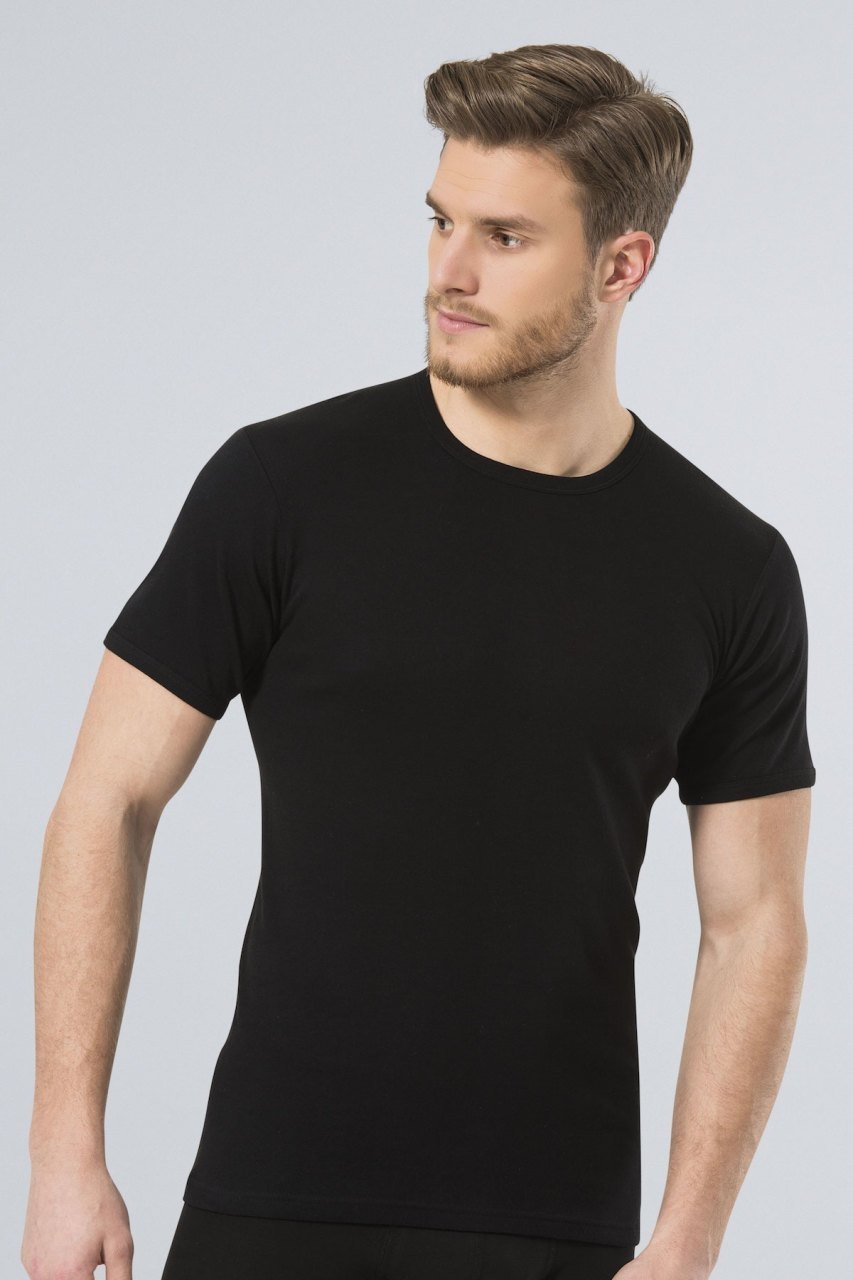 Siyah, ribana dokulu, O yaka kesim erkek fanila. Yumuşak pamuk kumaşıyla rahat bir giyim sunar. %100 Pamuk