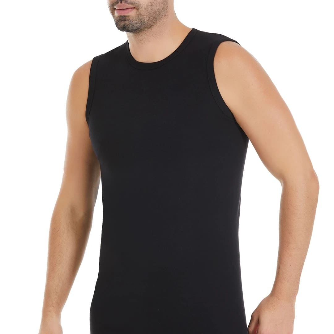 Siyah renkte, ribana dokusu ile esnek bir yapıya sahip sıfır kollu erkek atlet. %100 Pamuk