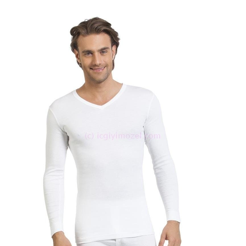 Beyaz renkte, ribana dokulu, uzun kollu V yaka erkek atleti. Esnek yapısı sayesinde rahat bir kullanım sunar. %100 Koton
