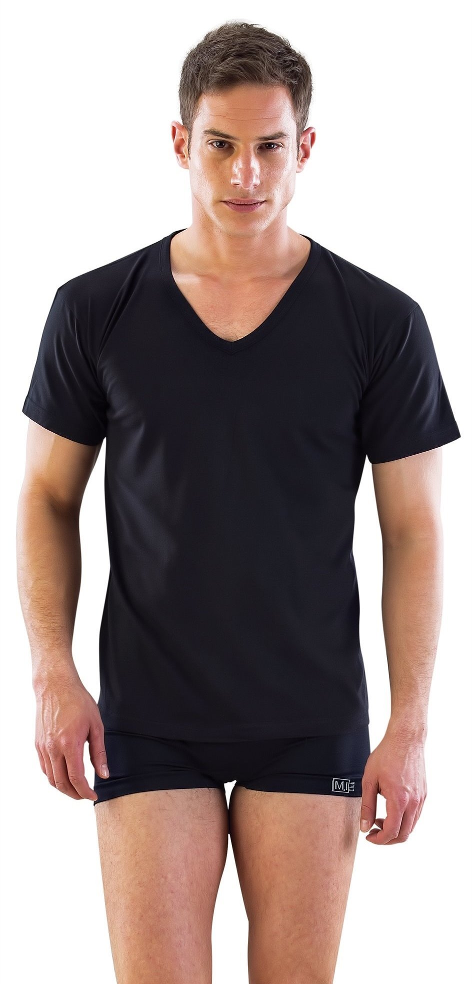 Siyah ve gri renk seçeneklerine sahip, ribana dokulu, V yaka kısa kol erkek atlet.