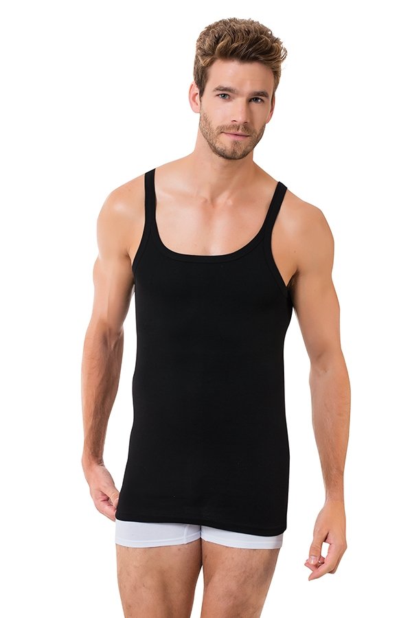 Siyah renkte, ribana V yaka kesimine sahip ince askılı erkek atlet. Yumuşak pamuk dokusu ile konfor sunuyor. %100 pamuk