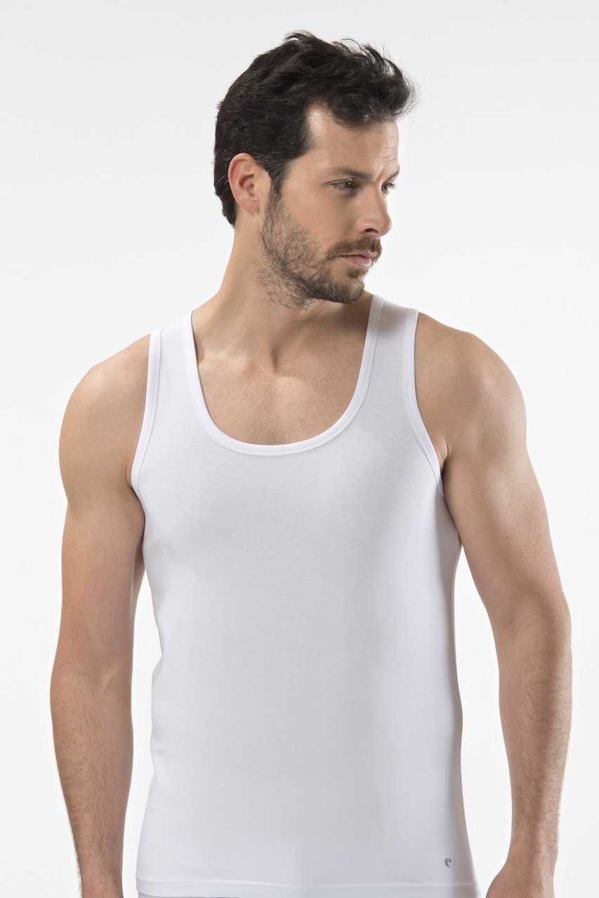 Beyaz renkte, ribana yaka kesimine sahip, esnek yapısıyla konfor sunan bir erkek atleti.