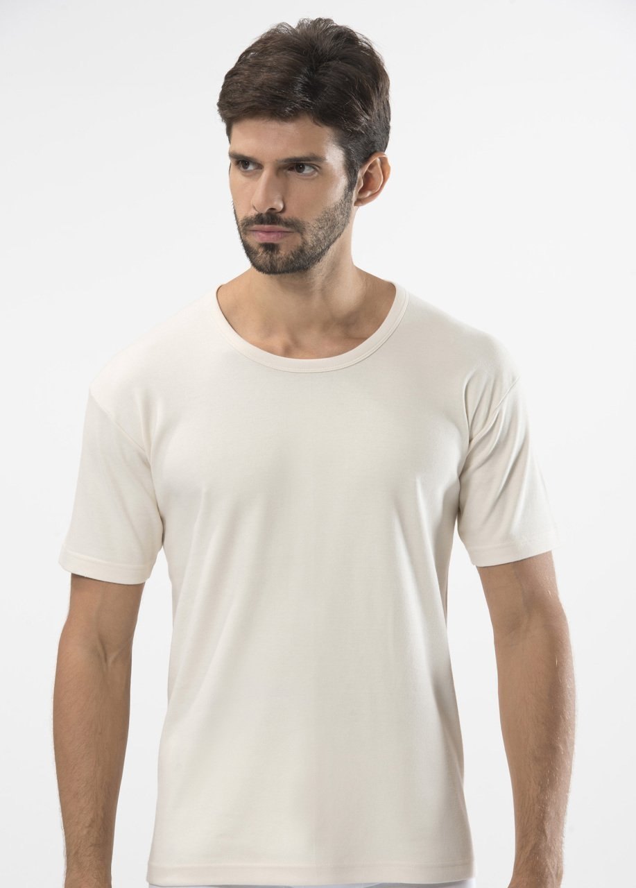 Krem renginde, yumuşak dokulu ve uzun boylu O yaka erkek fanila. Esnek kumaşıyla rahat bir giyim sunar.