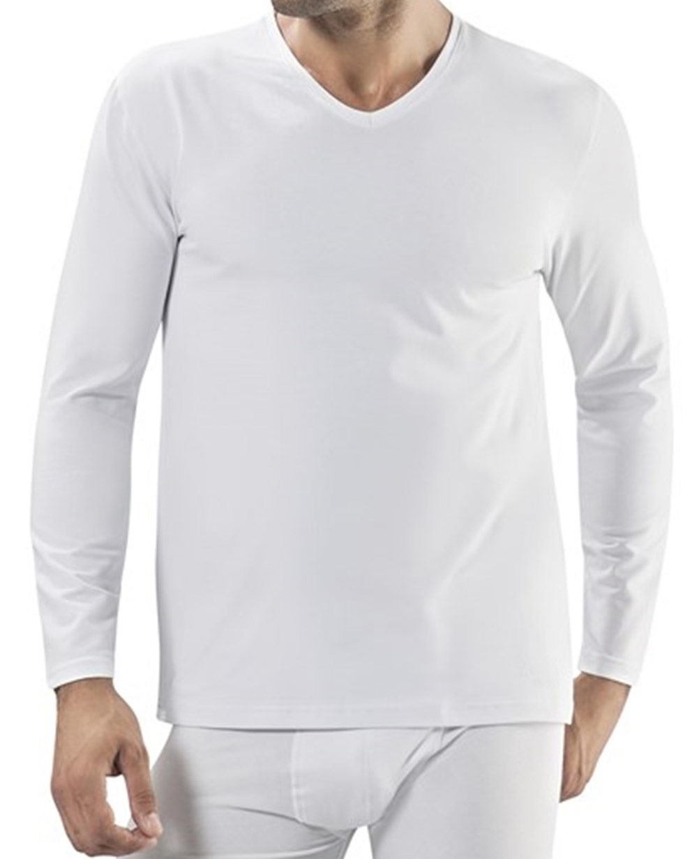 Siyah, koyu gri ve beyaz renk alternatifleriyle, pamuklu uzun kol V yaka erkek atlet. %90 Pamuk, %10 Likra