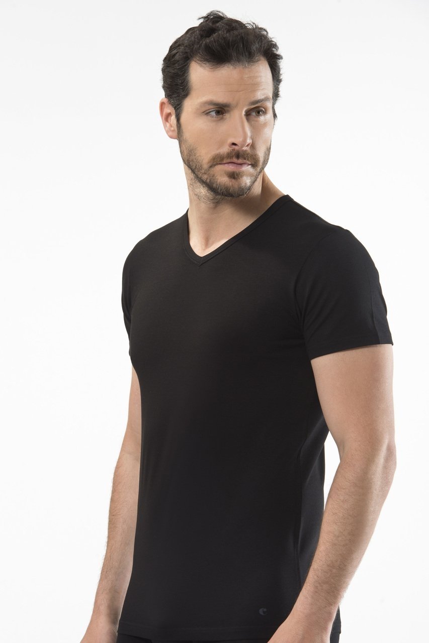Siyah renkte, V yaka kesime sahip pamuklu erkek atlet. Yumuşak doku ve esnek yapısıyla dikkat çekiyor.