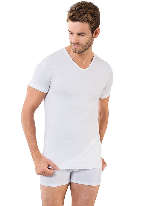 Yumuşak dokulu, pamuklu V yaka erkek atlet, beyaz renkte ve rahat bir kesime sahip. %100 Koton