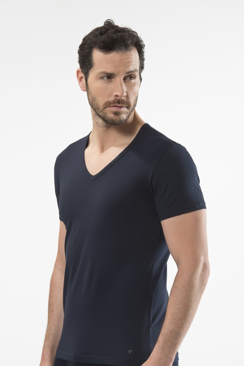 Lacivert renkte, V yaka ve kısa kollu kesimiyle, hafif pamuklu bir atlet.
