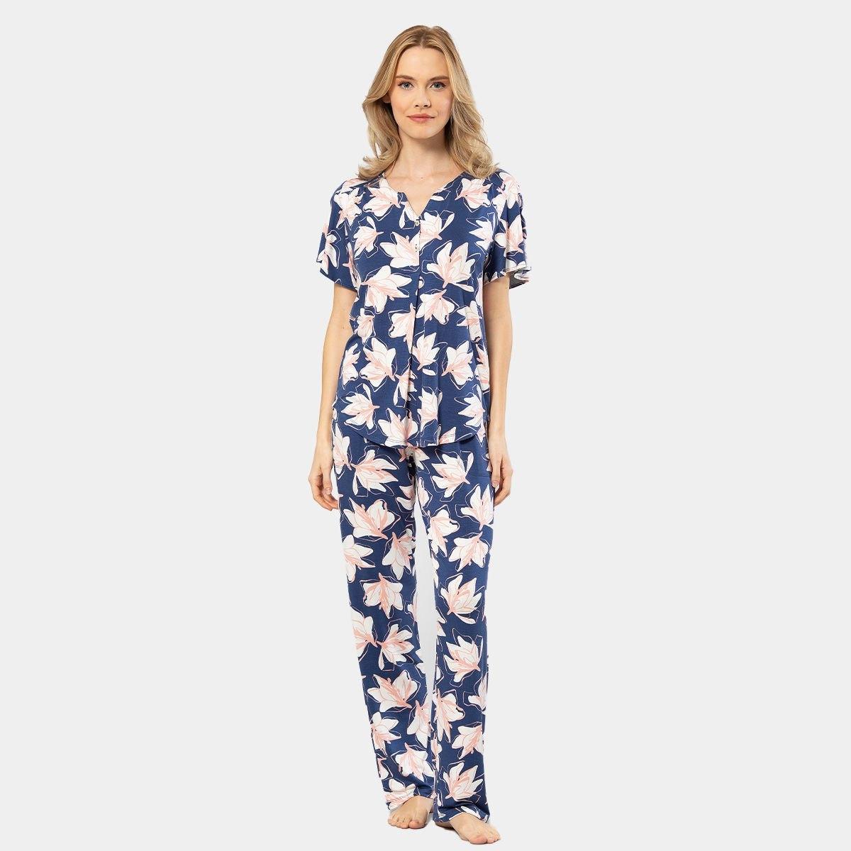 Lacivert tonlarında, kısa kollu gömlek yaka kesime sahip, yumuşak dokulu pijama takımı. %95 Viskon, %5 Elastan