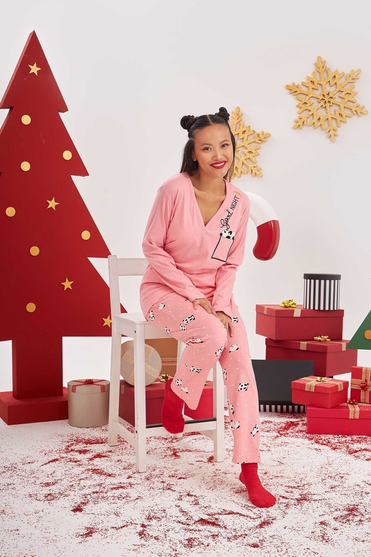 Pembe tonlarında, sevimli pandalı desenlerle bezeli V yaka pijama takımı, şık ve rahat kesimiyle dikkat çekiyor. %100 Pamuk