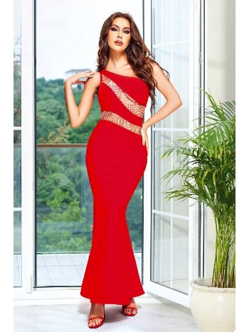 Tek Omuz Askılı Kırmızı Uzun Elbise Pink Night 5523