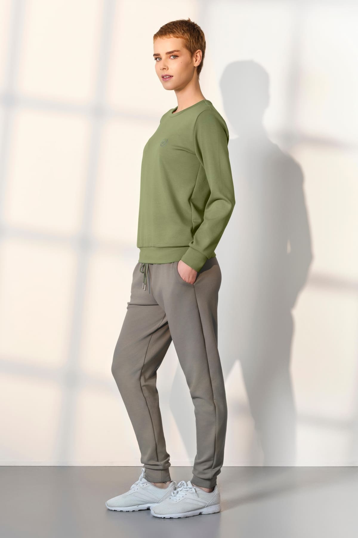 Lila tonlarında, yumuşak dokulu sweatshirt ve jogger pantolondan oluşan eşofman takımı. %50 Polyester, %45 Bamboo, %5 Elastan