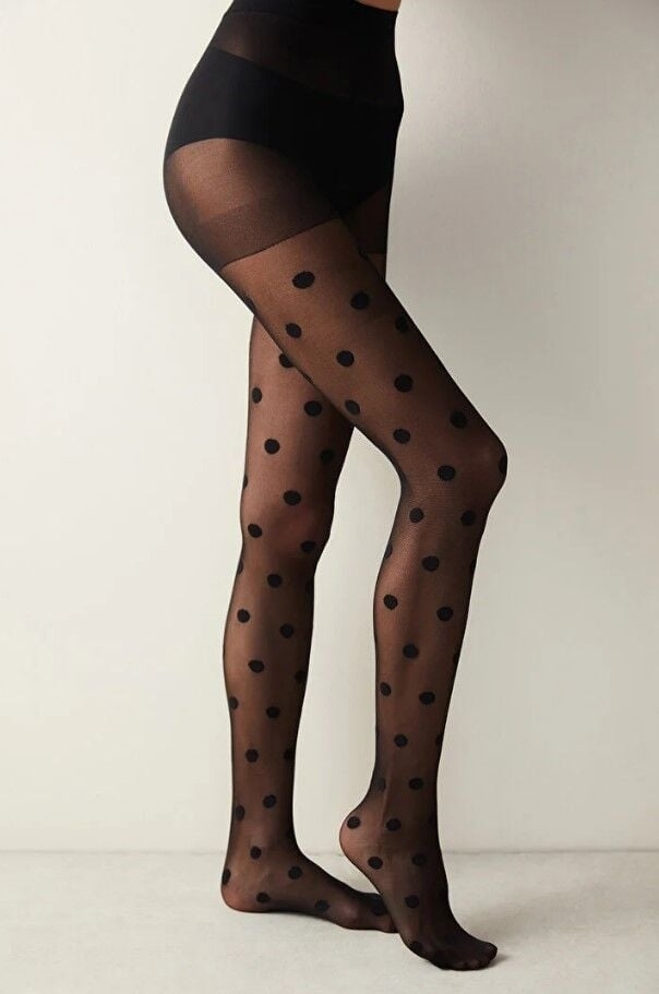 Somon renginde, puantiye desenli, ince dokulu külotlu çorap, hafifliğiyle öne çıkıyor.
