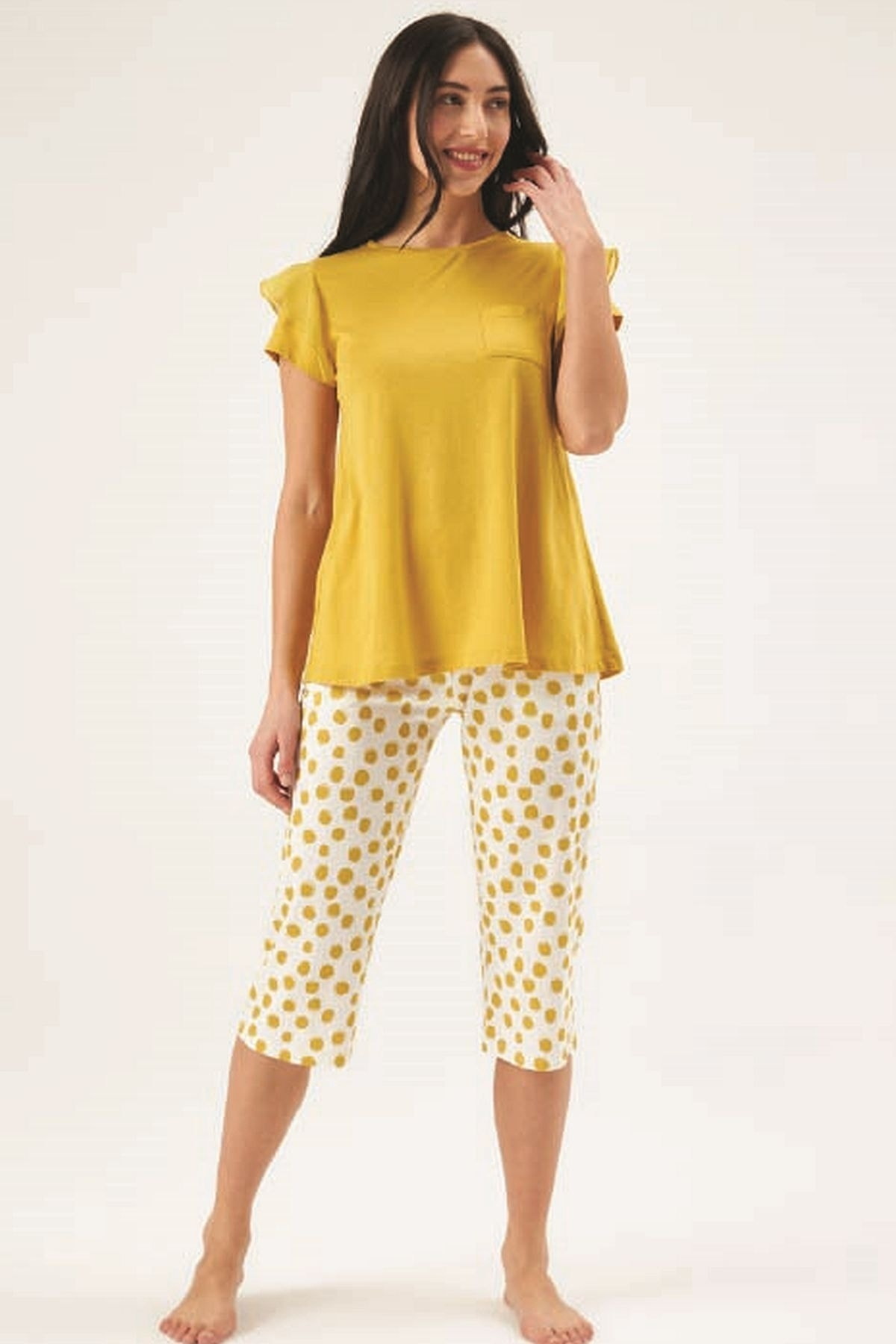 Sarı puantiyeli tasarıma sahip kısa kollu kapri pijama takımı, hafif ve esnek kumaşıyla rahat bir uyku deneyimi sunuyor.
