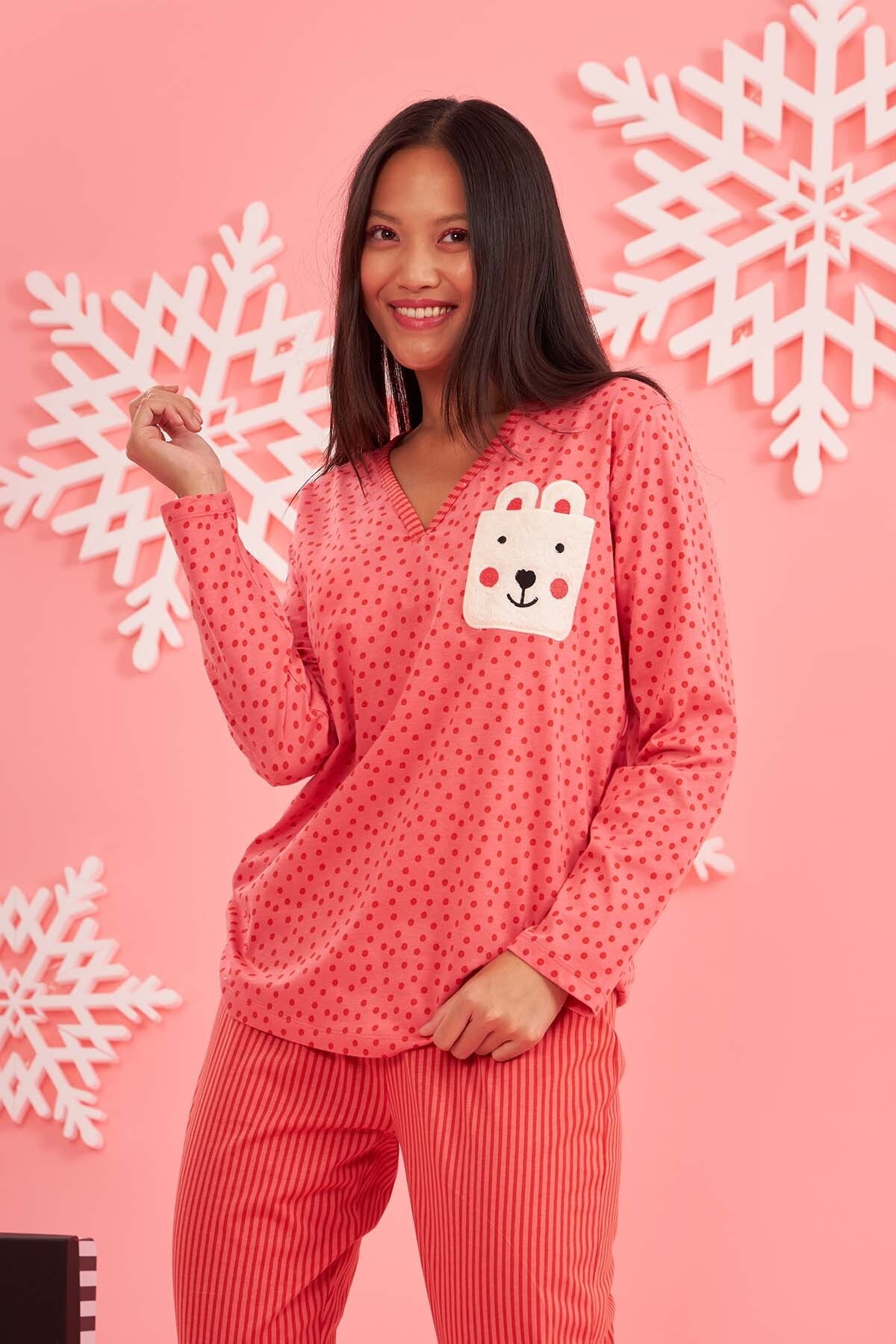 Takımın uzun kollu tasarımı, mevsimsel geçişlerde kullanıma uygun olmasını sağlıyor. Gündüz evde rahatça dolaşabileceğiniz bu pijama takımı, akşam misafirlerinizi ağırlarken de estetik bir görünüm sunuyor. Hem konforlu hem de şık bir alternatif arayanlar için bu pijama takımı, dolabınızda yer bulmayı hak ediyor.