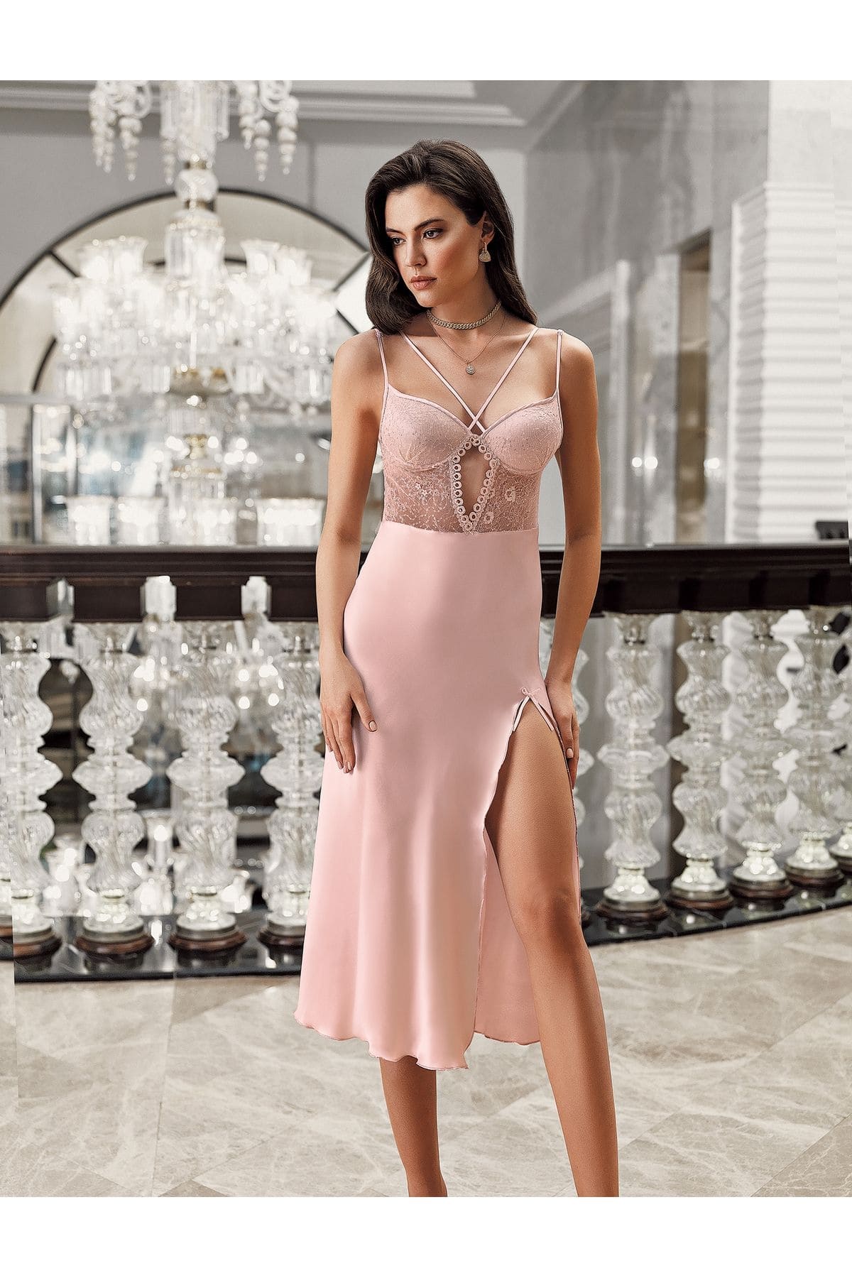 Pudra rengi saten kumaş ve transparan dantel detaylarla zenginleştirilmiş iki parçalı gecelik takımı.