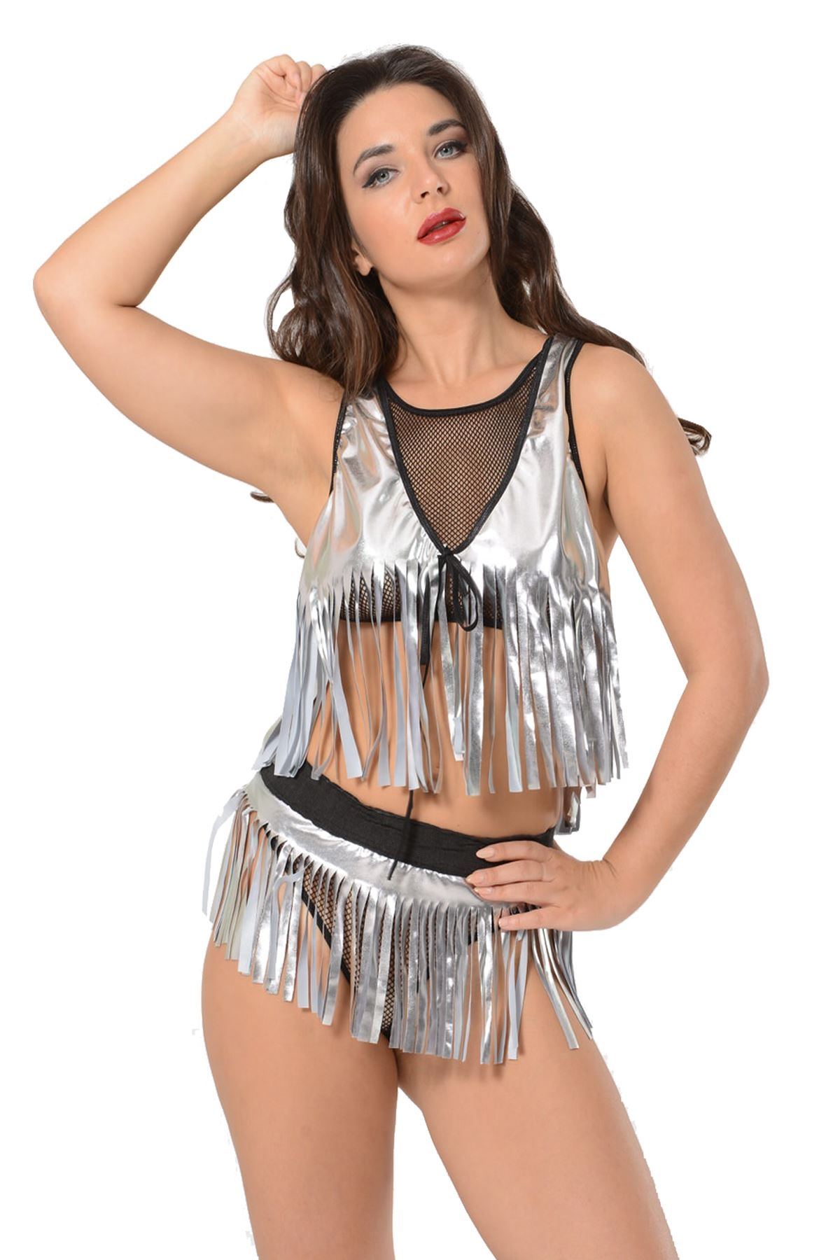 Gri tonlarındaki bu püsküllü şort takımı, özel gecelerde kendinizi özgür hissetmenizi sağlıyor. Lame ve likra kumaşının birleşimi, hem hafif hem de esnek bir yapı sunarken, vücut hatlarınızı zarif bir şekilde ortaya koyuyor. Özellikle yaz aylarında serin tutan yapısı sayesinde sıcak havalarda rahatça giyilebilir. Kış aylarında ise katmanlı giyimde mükemmel bir tamamlayıcı olarak öne çıkıyor.