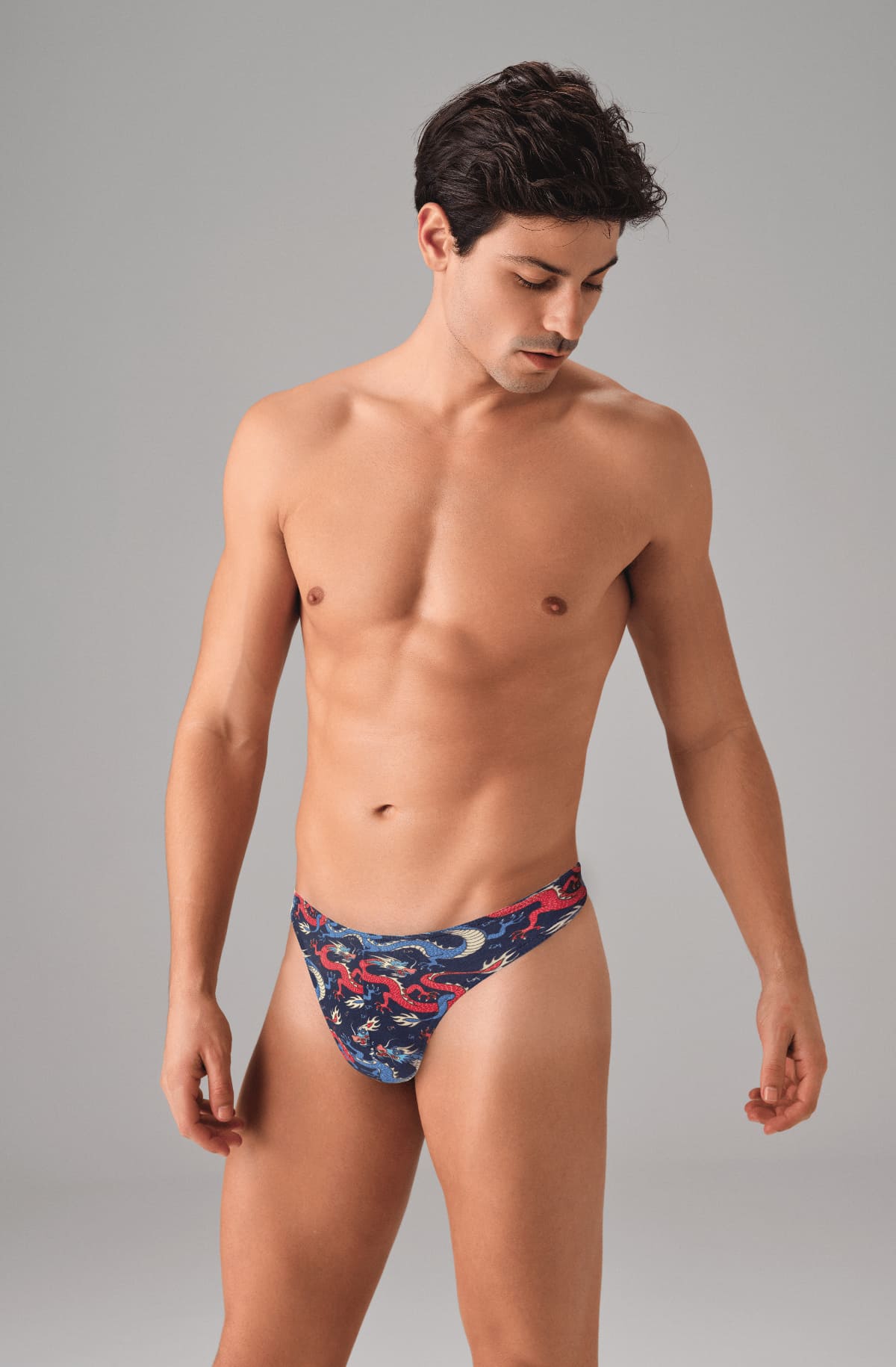 Ekru tonlarında, fantezi ejderha deseniyle dikkat çeken erkek string modelidir. Yumuşak dokusu ile konfor sunar.