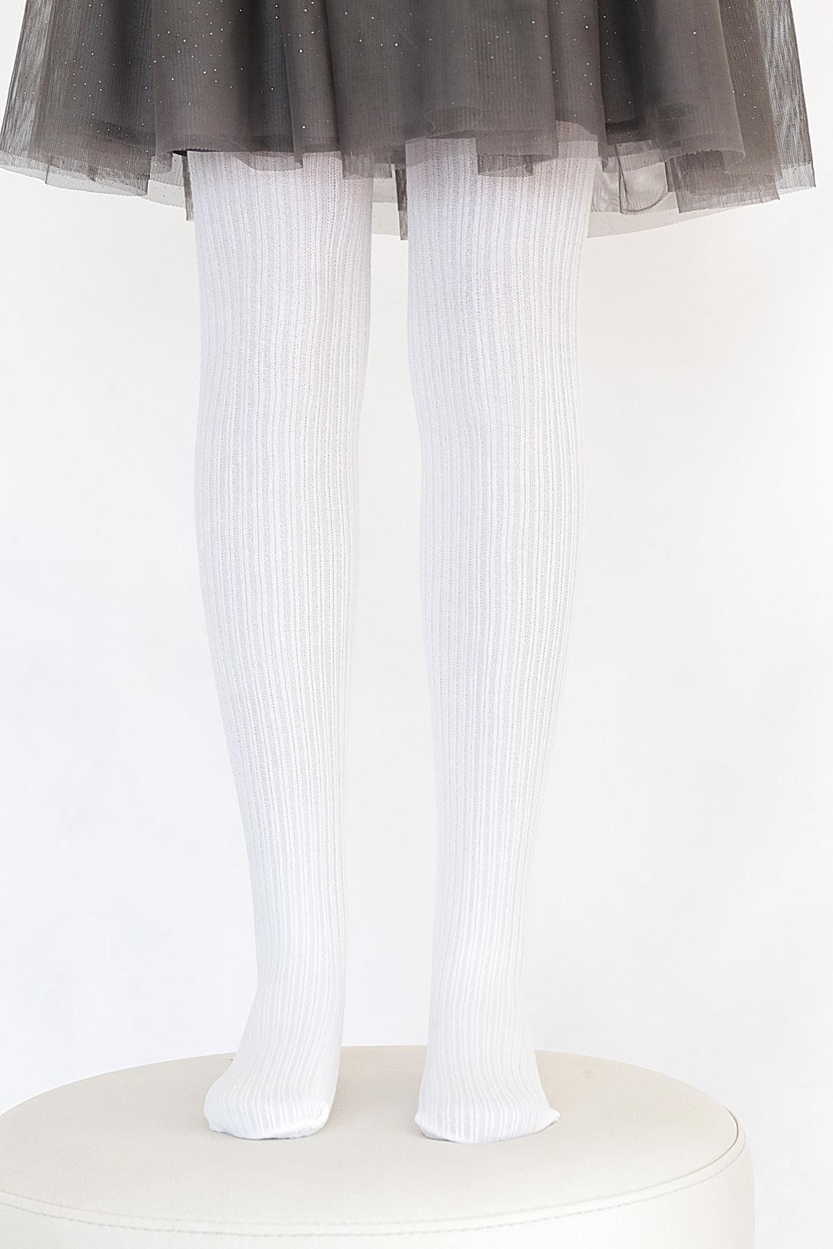 Beyaz renkli, ribana dokulu çocuk külotlu çorap. Kaydırmaz taban detayı ile güvenli yürüyüş sunar. %72 Viskon, %24 Polyamide, %4 Elastane