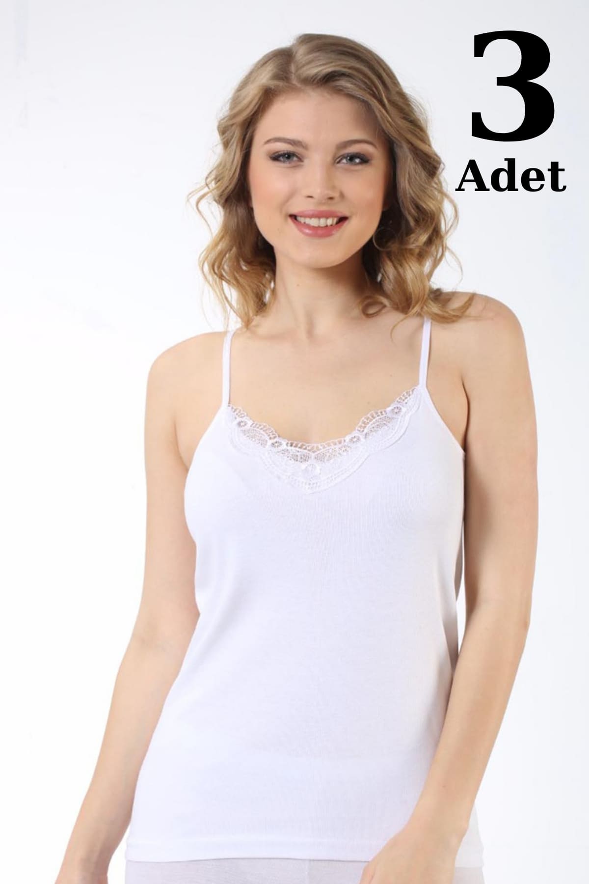 Beyaz renkte, ribana kumaş dokusuna sahip ip askılı kadın atlet, şık güpür detaylarıyla tasarlanmıştır. %100 Pamuk