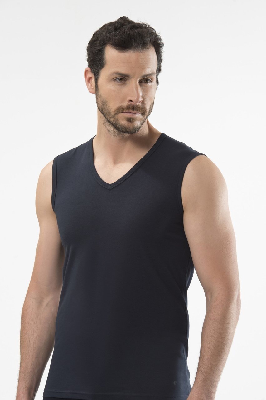 Lacivert tonlarında, ribana kesim detayına sahip, esnek yapılı V yaka erkek atlet.