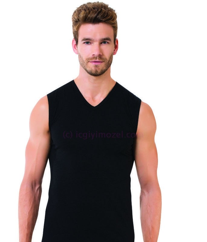 Siyah renkli, pamuklu ribana dokusuna sahip kolsuz V yaka erkek atlet, esnek yapısıyla konfor sunuyor. %100 pamuk