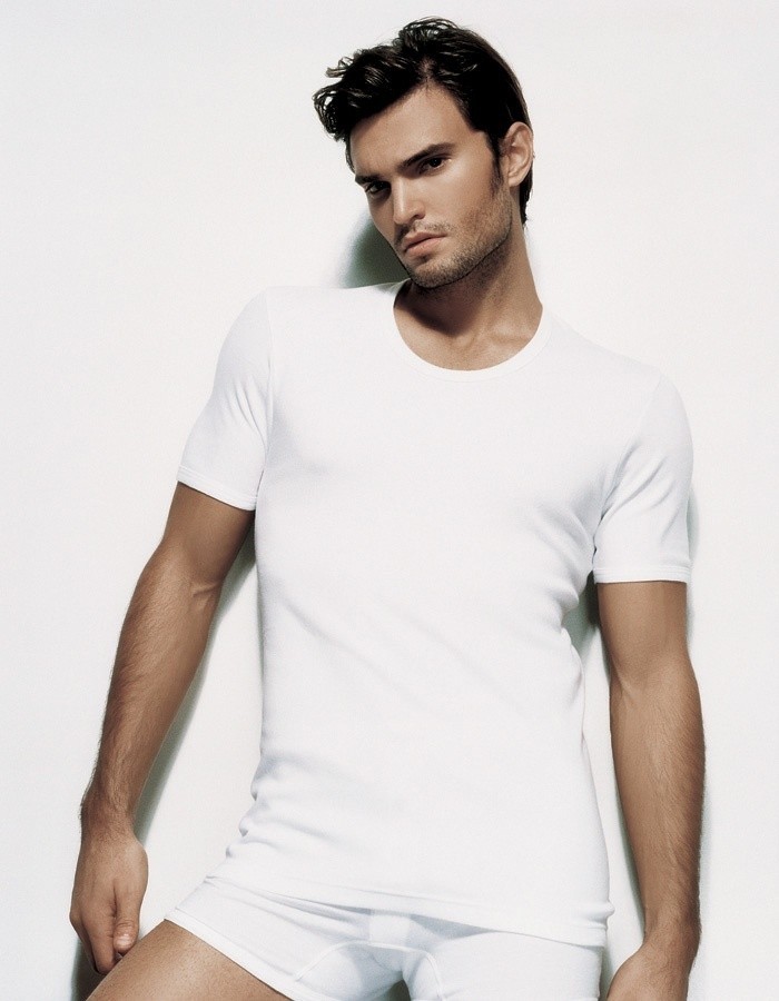 Beyaz renkli, ribana kesim ve bisiklet yaka tasarıma sahip, pamuklu erkek t-shirt. %100 Pamuk