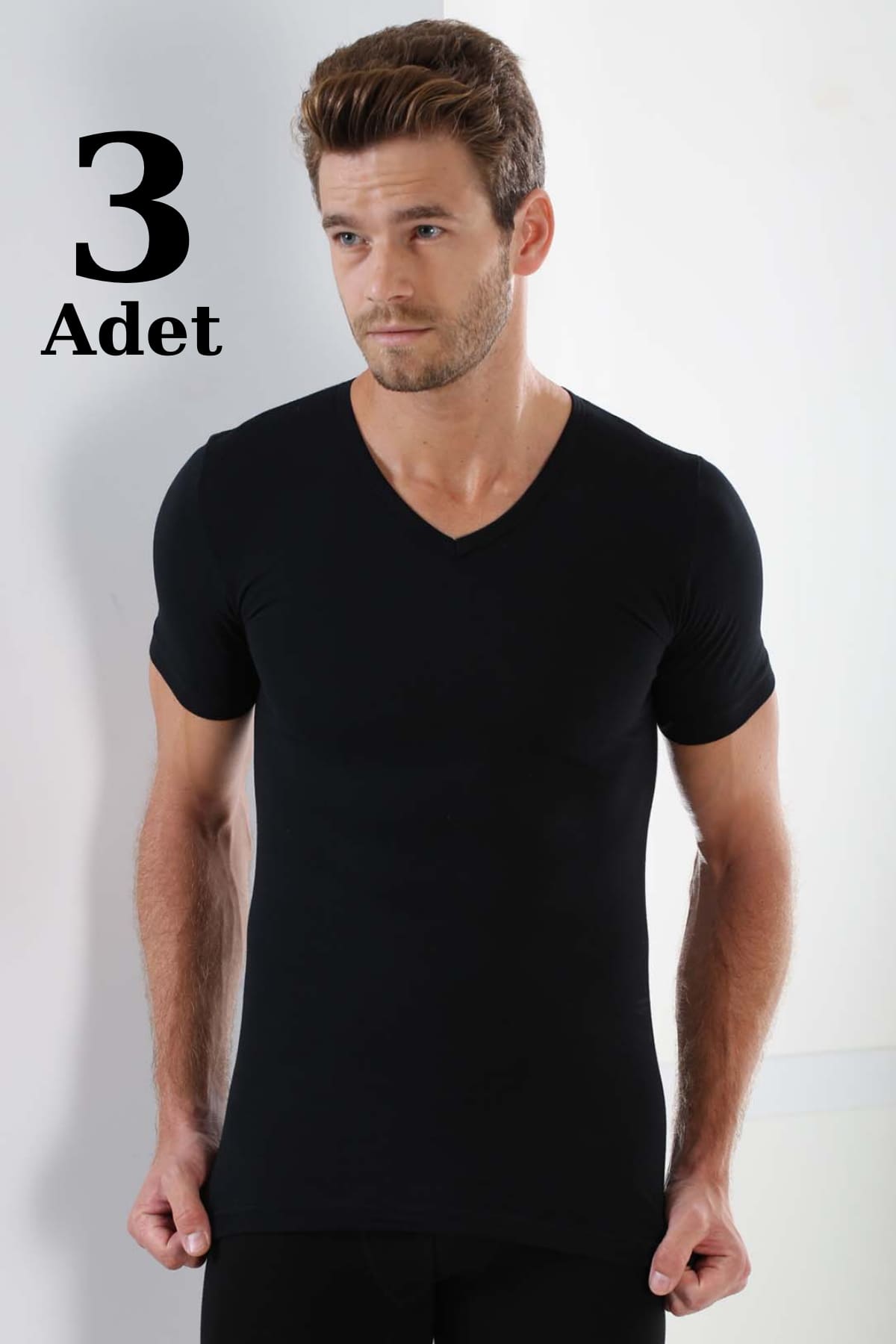 Siyah renkte, ribana dokulu, V yaka kesimli erkek atleti. Pamuklu yapısı ile hem şık hem de konforlu. %100 Pamuk Ribana