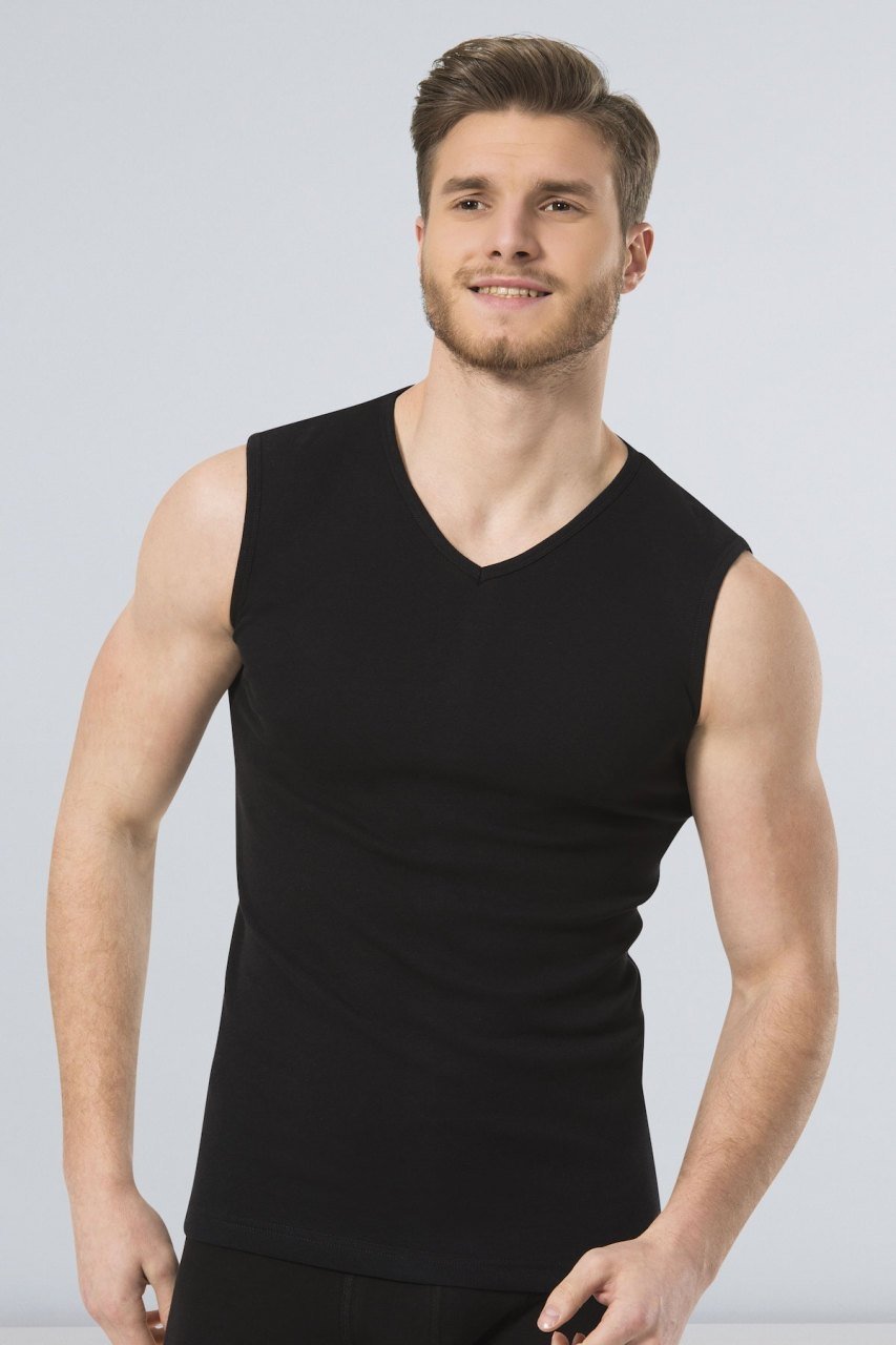 Siyah renkte, ribana dokuya sahip V yaka erkek atlet. Esnek yapısı ve hafif dokusuyla gün boyu rahatlık sağlıyor.