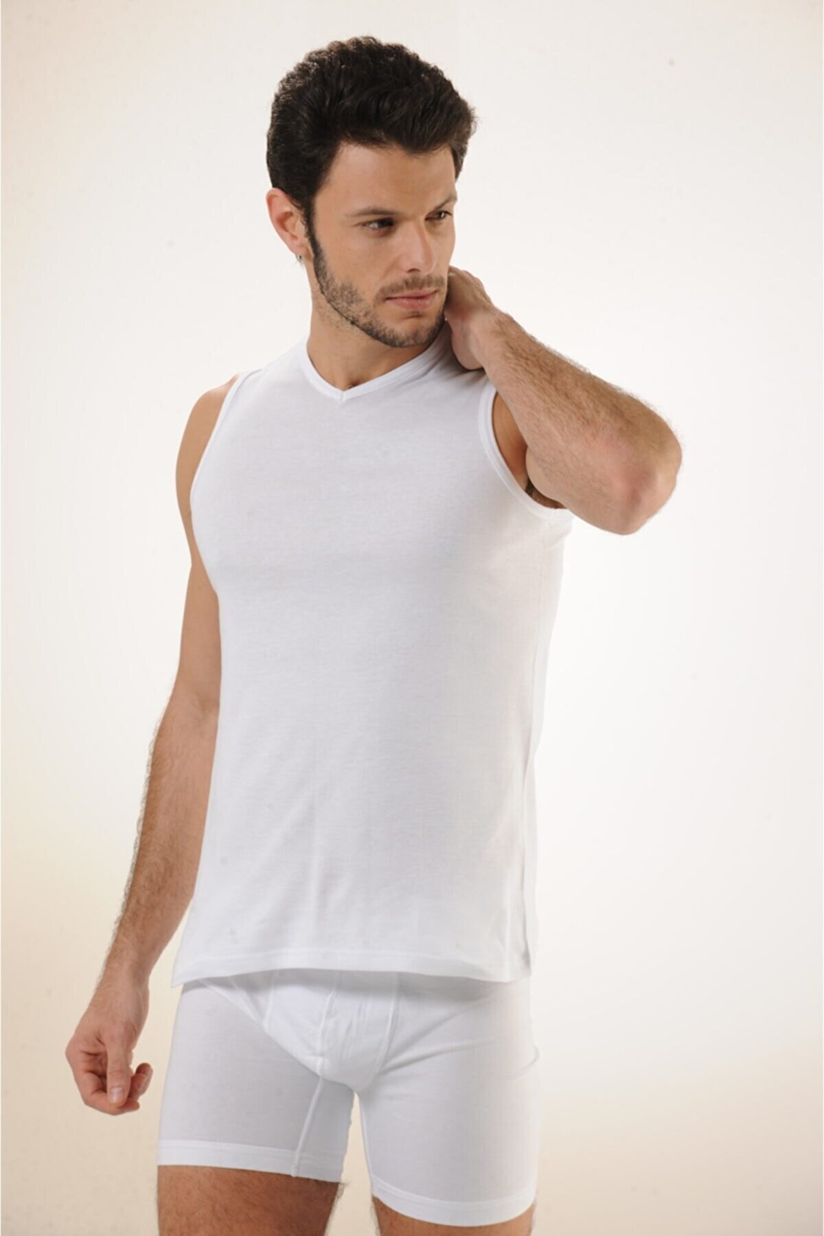 Beyaz renkte, pamuklu dokusu ve ribana kesimi ile rahat bir V yaka atlet. %100 Koton