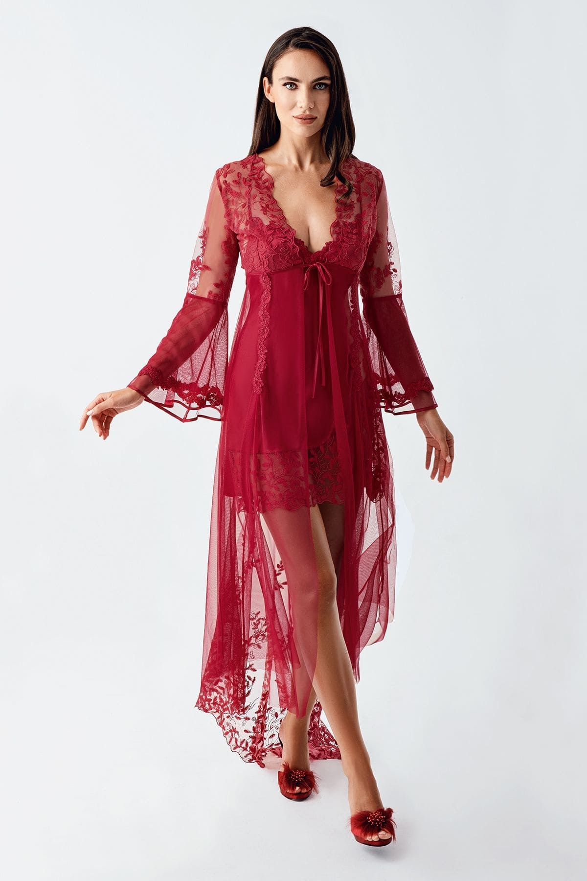 Bordo saten dokusu ve transparan dantel detayları ile şık bir gecelik takımı.