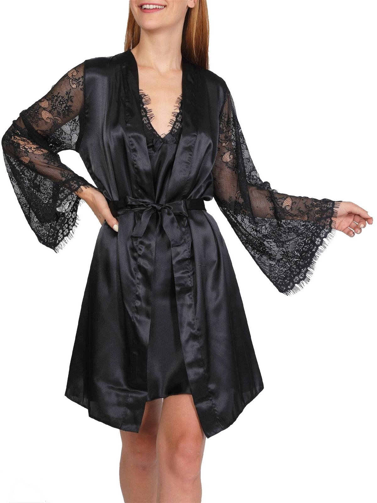 Siyah saten kumaştan üretilmiş, dantel detaylı gecelik ve sabahlıktan oluşan şık bir takım.