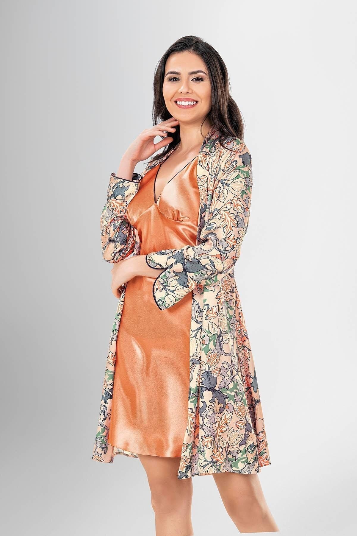 İnci tonlarında, hafif saten dokusu ile zarif bir kısa sabahlık ve gecelik takımından oluşuyor.