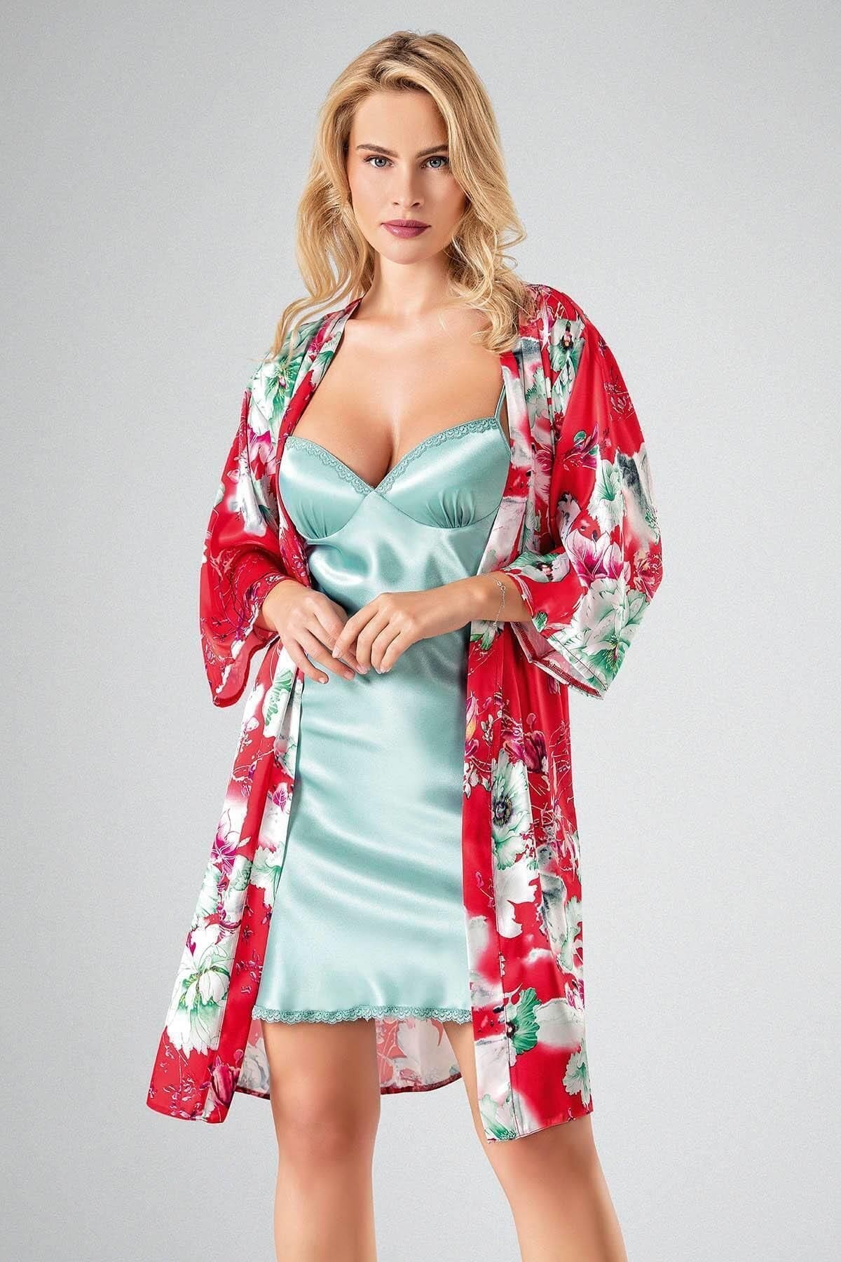 Yeşil saten dokusuyla şıklık sunan, iki parçadan oluşan sabahlıklı gecelik takımı. %100 Polyester
