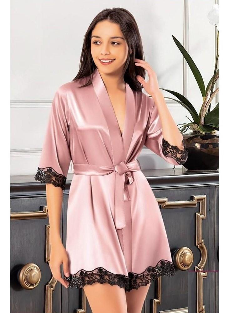 Vizon renk, dantel detaylı ve kuşaklı kesimiyle şık bir sabahlık. Saten kumaşıyla rahat bir kullanım sunuyor.
