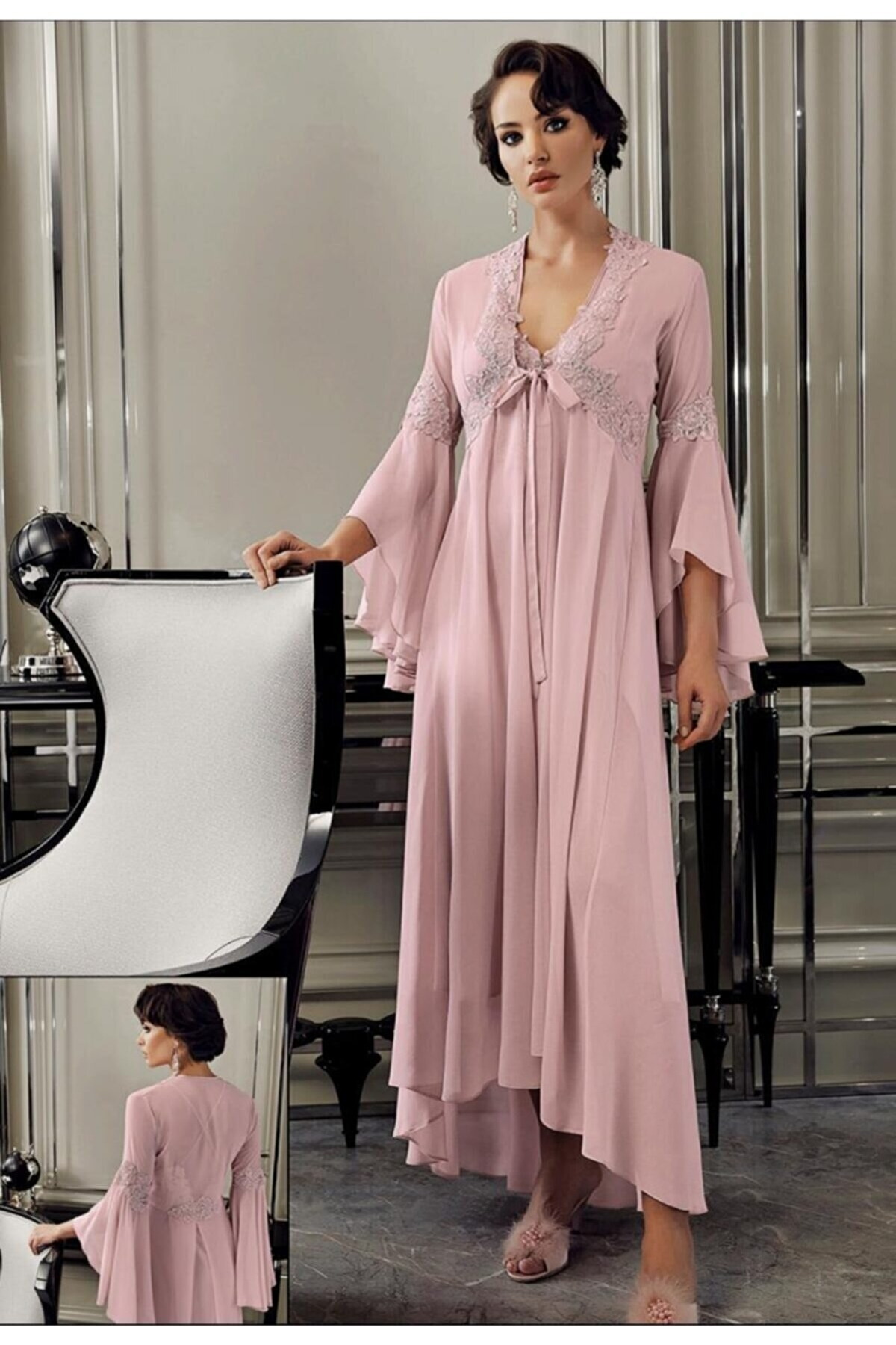 Pembe ve siyah-gri tonlarındaki dikiş detayları ile saten pijama takımı, zarif bir görünüm sunuyor.
