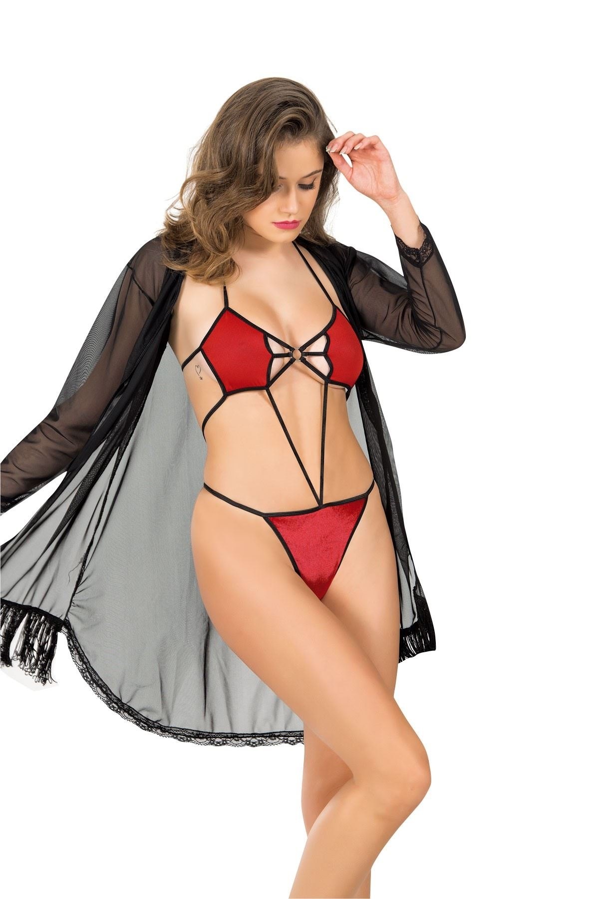 Kırmızı şifon kumaştan üretilmiş, dantel detayları ve hafif yapısıyla göz alıcı bir sabahlıklı sütyen takımı. %90 Şifon, %10 Elastan