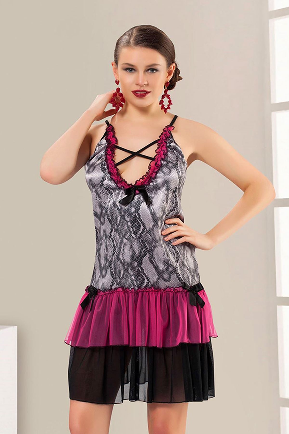 Karışık renklerde, şifon kumaştan tasarlanmış kısa gecelik, hafif dokusu ile ferahlık sağlıyor. %90 Şifon, %10 Elastan