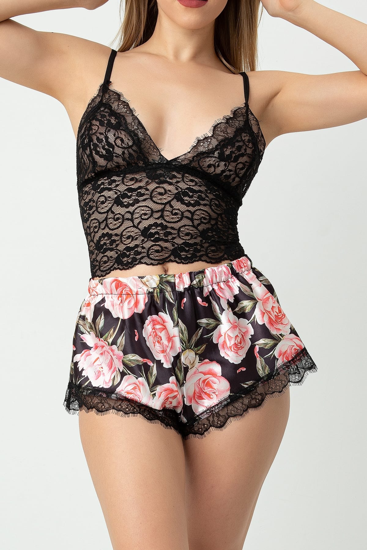 Çiçekli siyah dantel büstiyer ve şorttan oluşan bu takım, özellikle özel geceler için tasarlandı. Dantel dokusu, ürünün zarif görünümünü artırırken, kaliteli kumaşı sayesinde giydiğinizde kendinizi şık hissedeceksiniz. Göz alıcı çiçek desenleri, dantel ile birleşerek hem romantik hem de feminen bir hava katıyor. Bu tasarım, hem estetiği hem de rahatlığı bir arada sunuyor.