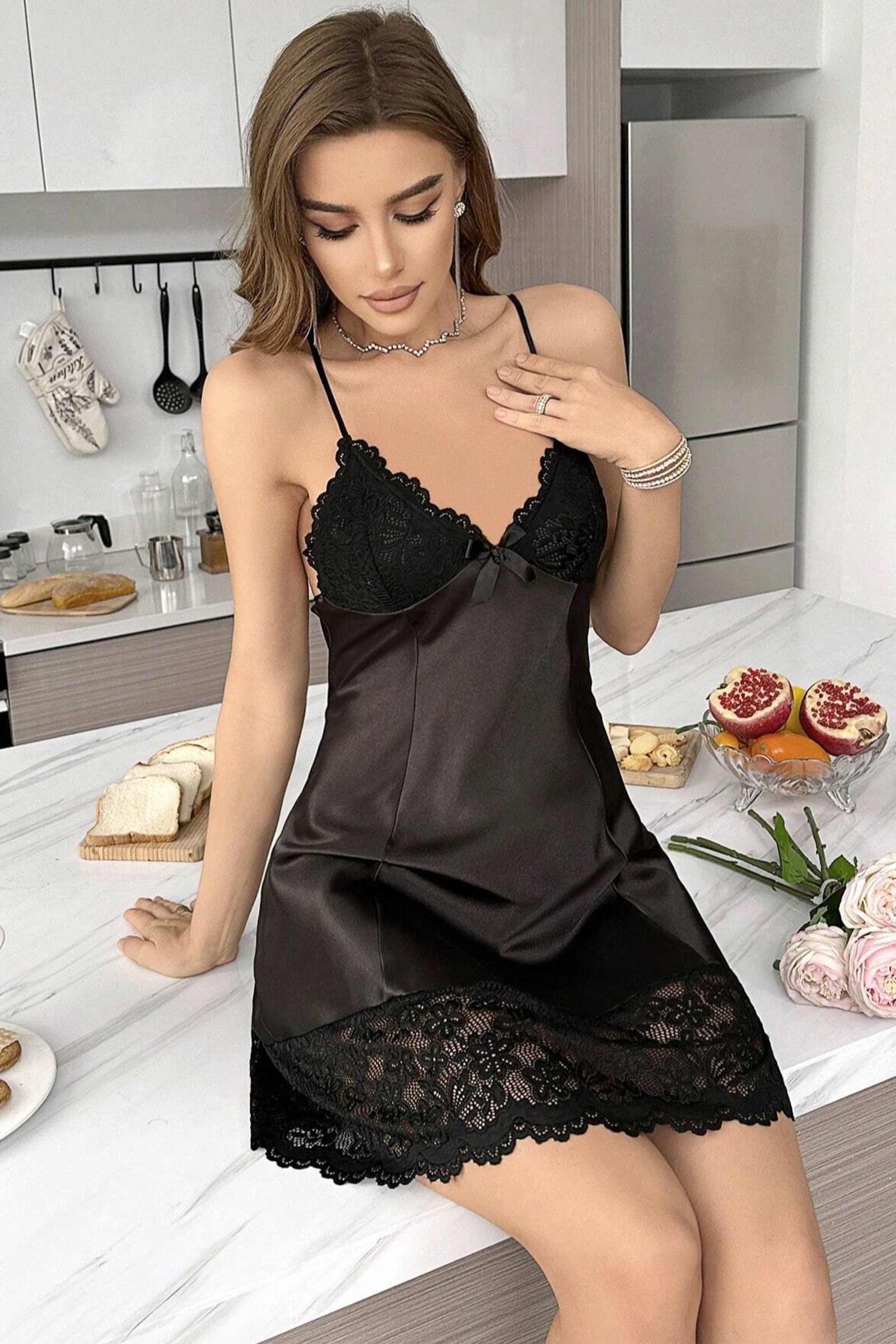 Parlak siyah saten kumaş üzerinde göğüs kupasını saran geniş çiçek danteli ve etek ucunda eşleşen dantel bordür. İnce ip askılar ve ön orta fiyonk detayı.
