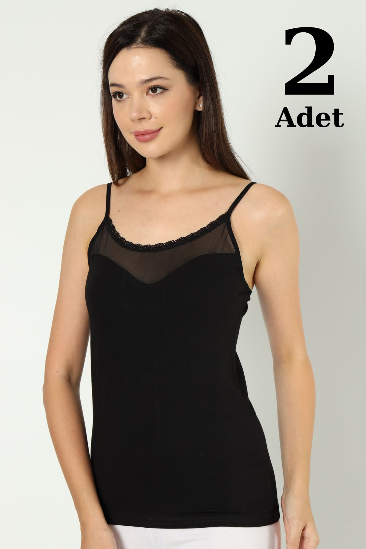 Siyah renkte, ince ip askılarıyla tasarlanmış, tül detaylı şık bir atlet. %93 Pamuk, %7 Likra