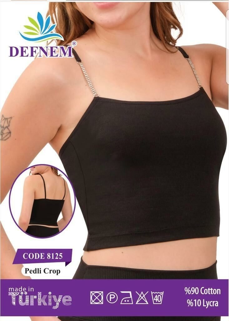 Parlak taş detaylı ince askıları ve düz yaka hattıyla dikkat çeken pamuklu pedli kadın crop top.