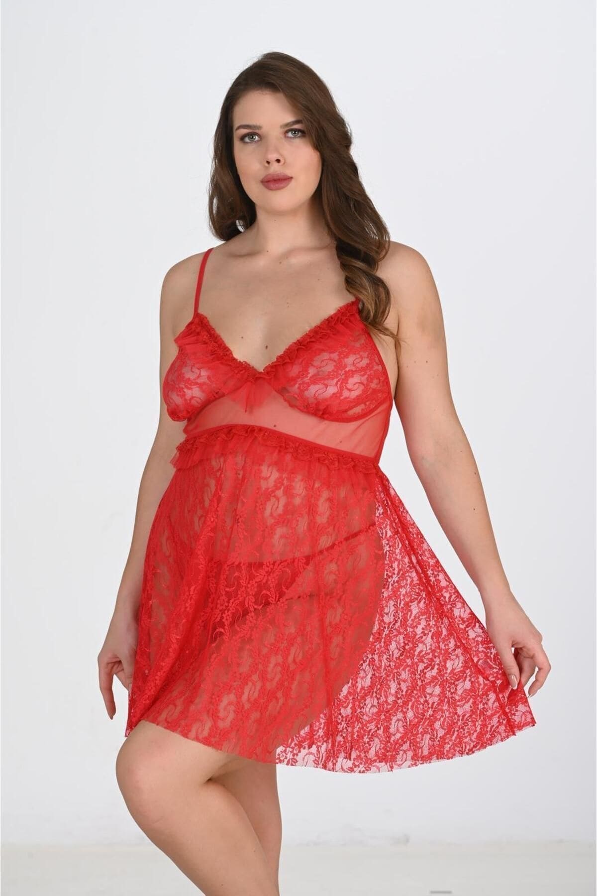 Kırmızı tül ve dantel detaylarla tasarlanmış, tek parça kesim gecelik, şık ve zarif bir görünüm sunar.