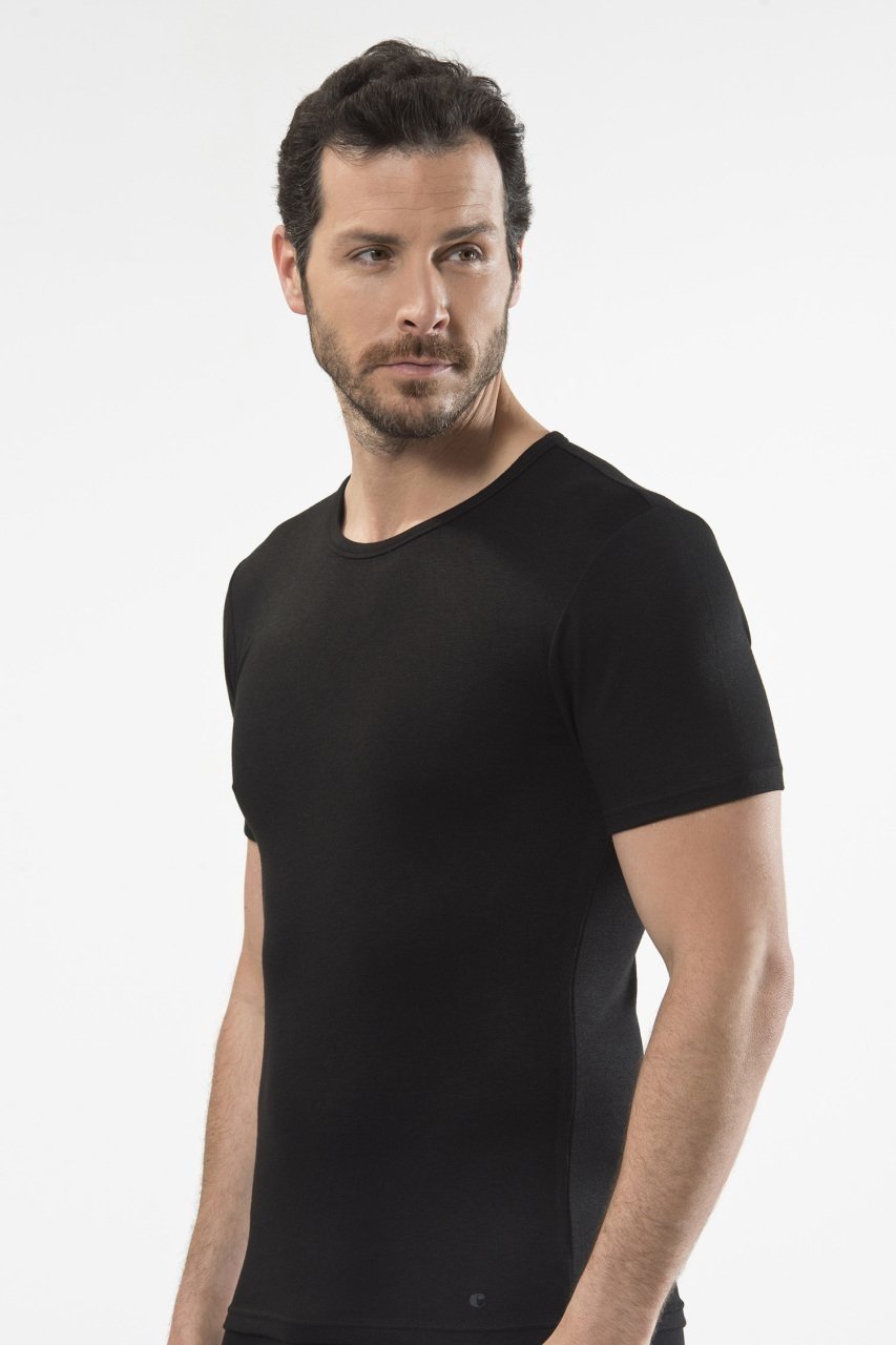 Siyah, kısa kol bisiklet yaka termal içlik, fırçalı iç yüzey ve esnek yapısıyla sıcak tutar.